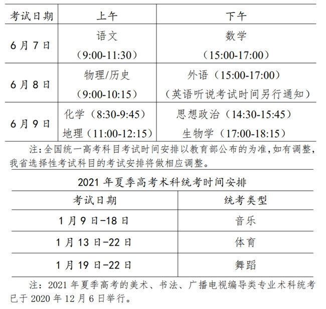 (一)考试科目2021年夏季高考实行“3+1+2”模式,“3”为全国统一高考科目的语文、数学、外语,“1+2”为广东省普通高中学业水平选择性考试(下称:选择性考试)科目。报考艺体类专业(含音乐类、美术类、书法类、舞蹈类、广播电视编导类、体育类,下同)的考生还需参加相应专业术科全省统一考试。