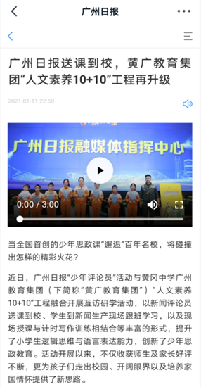 近日,广州日报“少年评论员”活动与黄广中学广州教育集团(下简称“黄广教育集团”)“人文素养10+10”工程融合开展互访研学活动,以新闻评论员送课到校、学生到新闻生产现场跟班学习,以及现场授课与计时写作训练相结合等丰富的形式,以此提升小学生逻辑思维与语言表达能力,创新少年思政教育。活动开展以来,不仅收获师生及家长好评不断,更为孩子们走出校园、开阔眼界以及培养家国情怀提供了新思路。本文为广州媒体门户平台“广州日报”和“新花城”对活动的新闻报道,请赏阅。