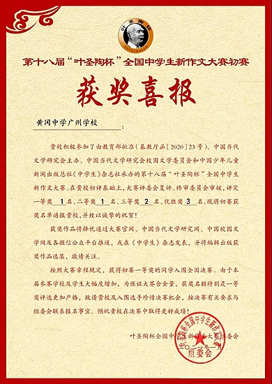 近日,第十八届“叶圣陶杯”全国中学生新作文大赛初赛结果正式公布:广州市黄广中学学子荣获一等奖(1名)、二等奖(1名)、三等奖(2名)、优胜奖(3名)。