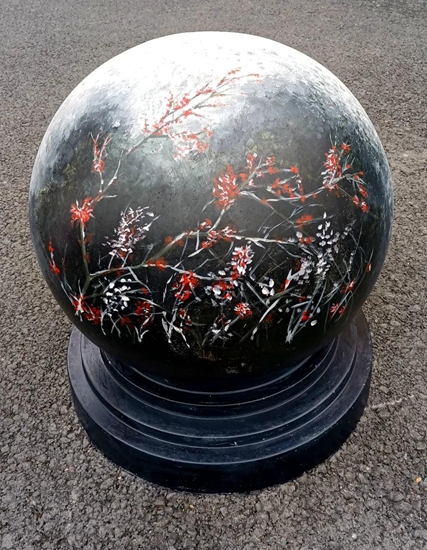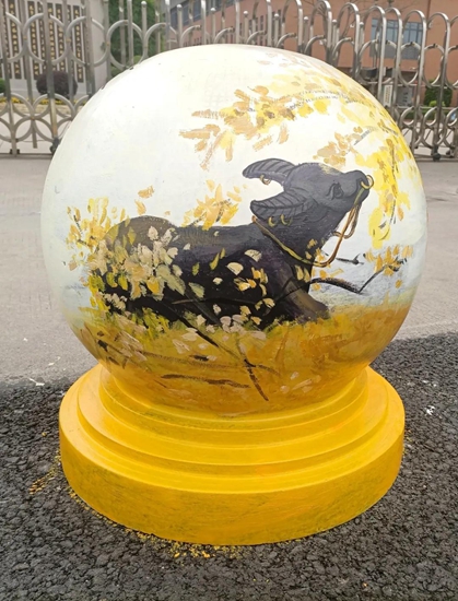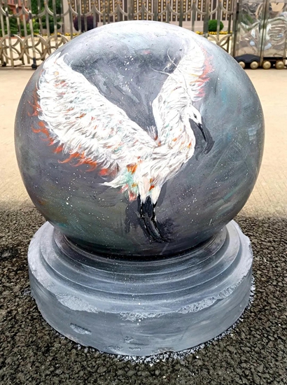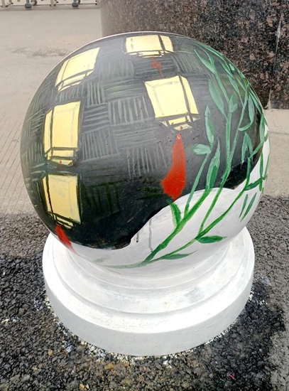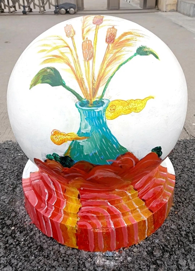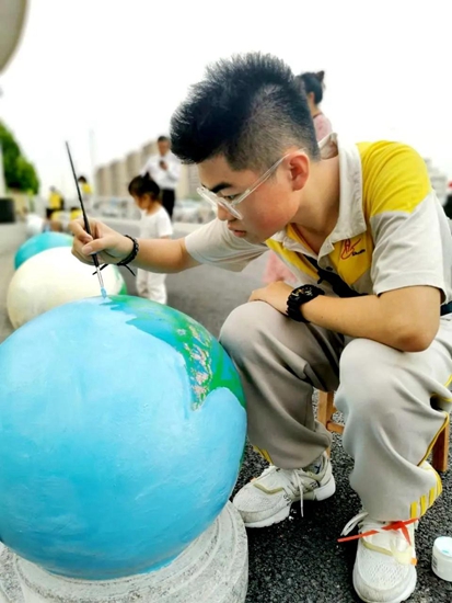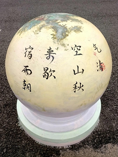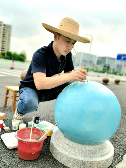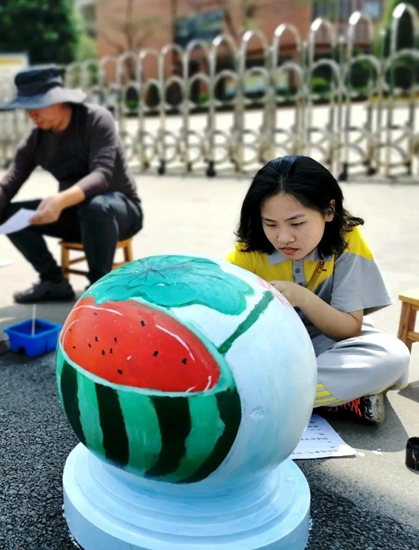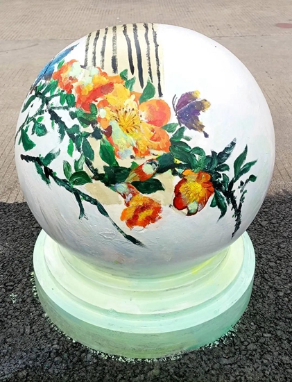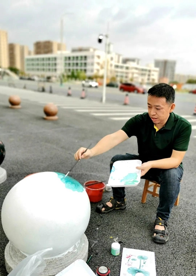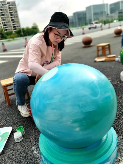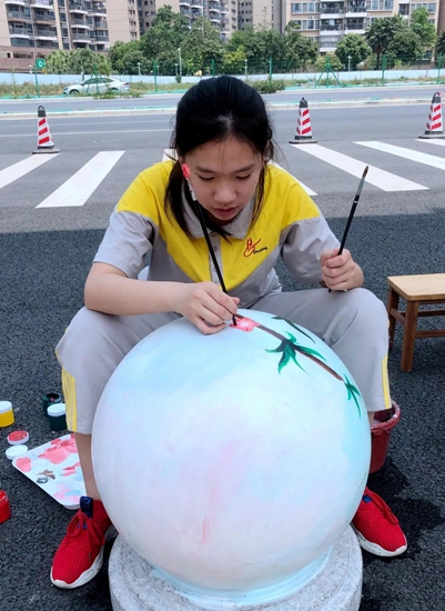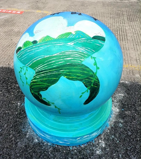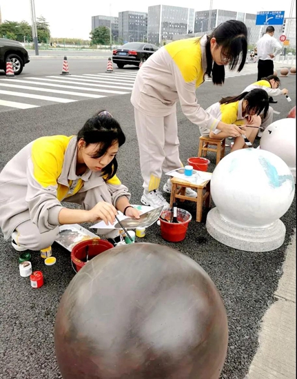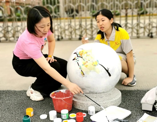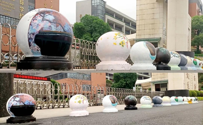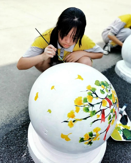 导师们的号召得到“学生画师”们迅速响应,沾上柔和颜料的画刷为石墩们抹去暗哑尘灰,流畅有致的粗细线条在石墩表面组合出美妙的图案,涂上亮眼色彩的画笔在一双双的巧手中注入了生动灵魂,笨重的石球们彷如被施以神奇魔法,在学生们的帮助下“脱胎换肤”。