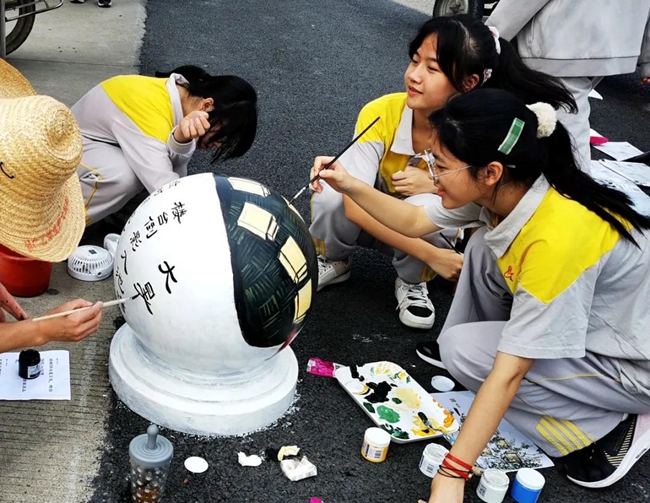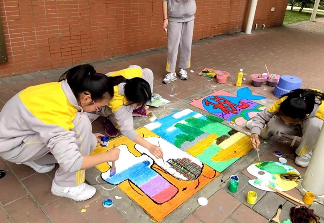 以学校负责绘画艺术教学的导师为首,由一众对色彩、线条独具天赋的“学生画师”加入而成的黄广艺术先锋队,迅速在校门处集结,大家“有备而来”——创意图案已完成前期最终设计,各种颜料画具已提前配套备齐,面对因暗淡无光而倍显“无精打采”的一座座小石墩,黄广艺术先锋队的每一员摩拳擦掌、跃跃欲试。