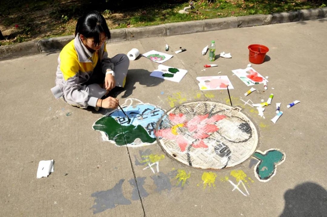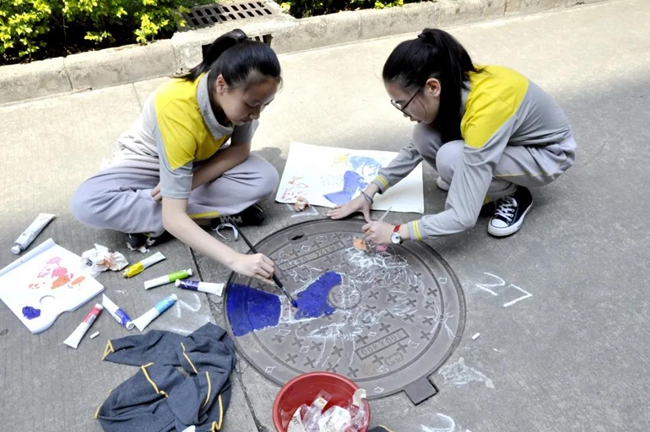 为了给学生营造更自在舒心、更积极向上的校园环境,为学生打造缤纷多彩的校园氛围,广州市黄广中学创意彩绘”的校园文化传统,具备绘画基础、创意天赋的学生们不时集结成“画师队”,为校园不起眼的角落涂上创意十足的色彩,学生宿舍的墙面上、校园小径的井盖上都留有一届又一届黄广学子青春迸发、天马行空的艺术火花。