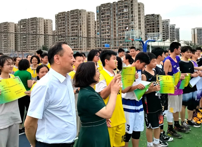 范小星校长、杨文化副校长更亲临决赛现场,向八年级篮球赛事的举办表达支持,为表现优异的班集体颁发奖杯、奖状,并表示希望八年级学生将在篮球场上充分展现的奋斗进取精神同样投入到课业学习当中,以强大的精神毅力、燃烧的奋发斗志去创造属于自己的进步和辉煌!