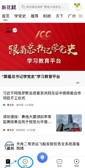 (2)安装成功后,进入“新花城”APP首页,点击底部菜单项“服务”。