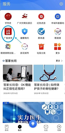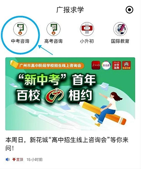 (3)进入服务页,点击上方“广报求学”图标,就能参加线上中考咨询会。