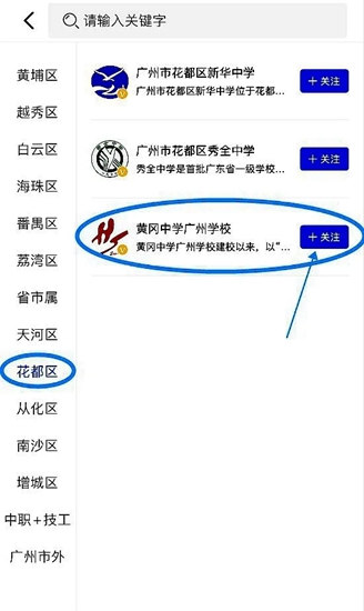 (5)选择学校:先选择花都区,即可找到广州市黄广中学/b>,点击“关注”,可第一时间了解学校最新动态。
