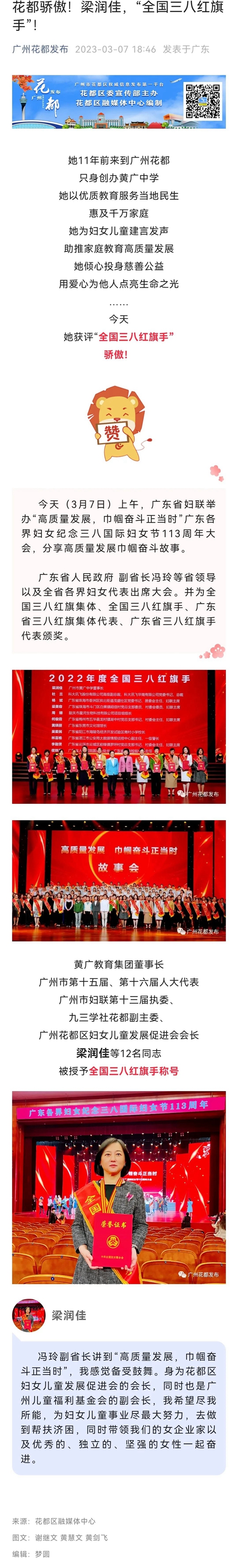 黄广教育集团董事长梁润佳作为今年全国民办基础教育办学者唯一代表、花都区近十九年来唯一“全国三八红旗手”获奖者(广州市仅2人,广东省仅12人)出席大会并接受表彰。