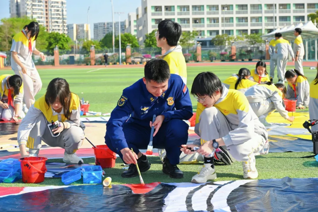 主持人花都区消防救援局的王佳怡与黄广学生代表100余人一起用巨幅长卷绘制“我心中的火焰蓝”。