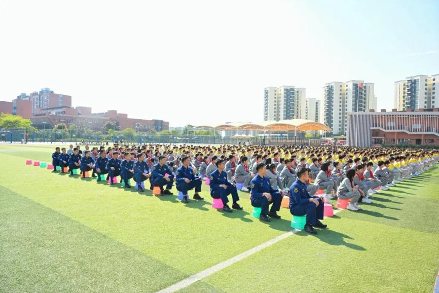 同日上午,黄广中学同步联合花都区教育局、花都区消防救援局隆重举行“生命至上 · 安全‘童’行”开学第一课——暨消防科普进校园主题活动。
