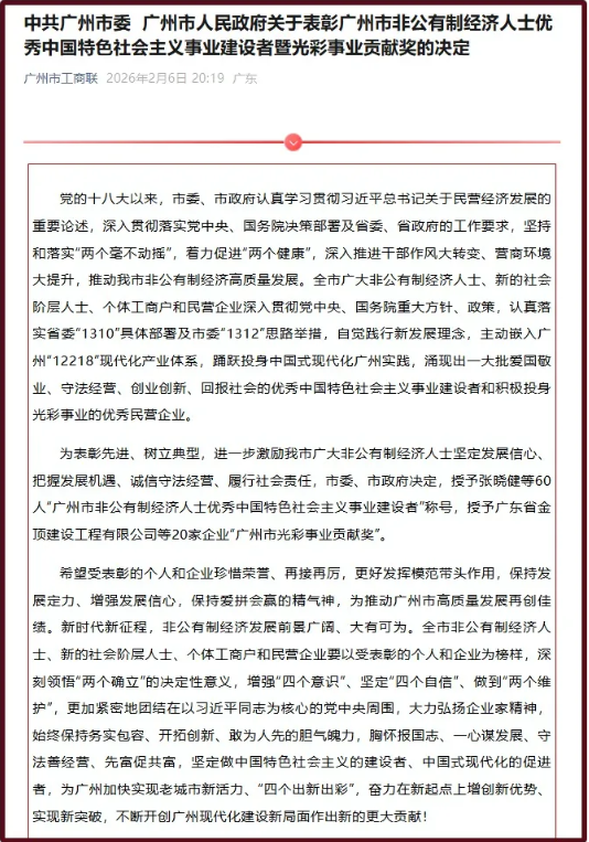 2月6日,广州市非公有制经济人士优秀中国特色社会主义事业建设者暨光彩事业贡献奖表彰大会召开。